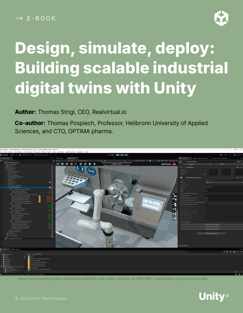 Welcome to realvirtual.io, the ultimate framework for Automation Concept Design, Simulation, Virtual Commissioning, and 3D Human-Machine Interface (HMI) development based on Unity. We've combined the power of Unity with the flexibility of realvirtual.io to empower you to create stunning 3D models for various destination platforms, including Windows, Linux, MacOS, iOS, Web GL, and Android.