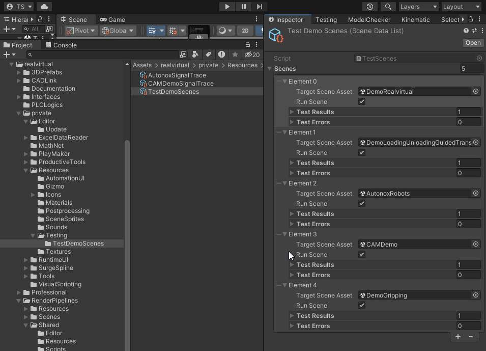 To prepare a scene for testing, you need to include a **Test Model Controller** in each test scene. You can add this controller to your project by using the prefabs located under `realvirtual > private > Resources > Testing`.
