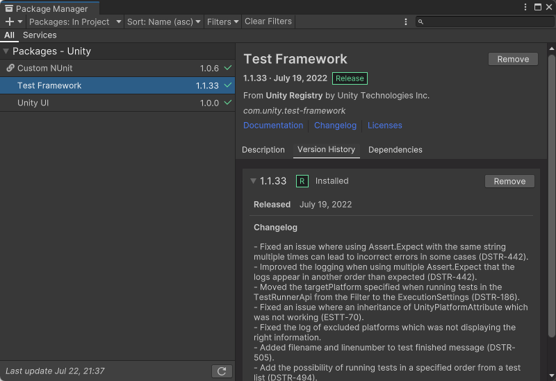 * Install **Unity Test Framework Version 1.1.33** via the Unity Package Manager.