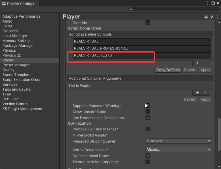 * Under **Scripting Define Symbols**, add `REALVIRTUAL_TESTS`.