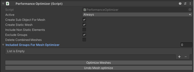 **Included groups for mesh optimizer:** Within this list you can define groups whose meshes may be merged.\