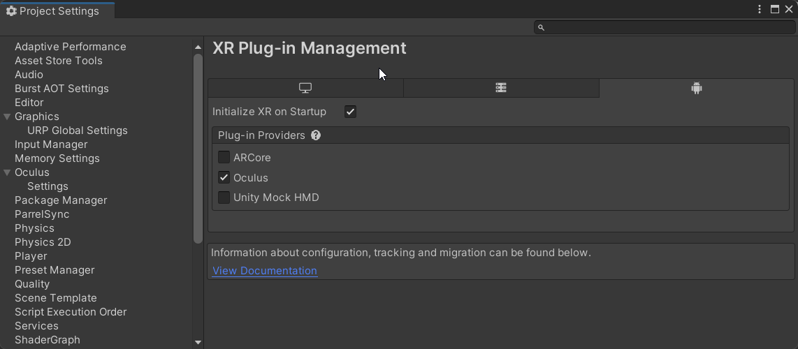 <figure><img src="https://260262196-files.gitbook.io/~/files/v0/b/gitbook-x-prod.appspot.com/o/spaces%2FpYxFg97YnJX96UzNNTSd%2Fuploads%2Fgit-blob-6eb2bbce5c55ab017342004457965b884dd8be69%2Fimage.png?alt=media" alt=""><figcaption><p>Enabled Oculus support (for Windows and Android) in XR Plug-in Management</p></figcaption></figure>