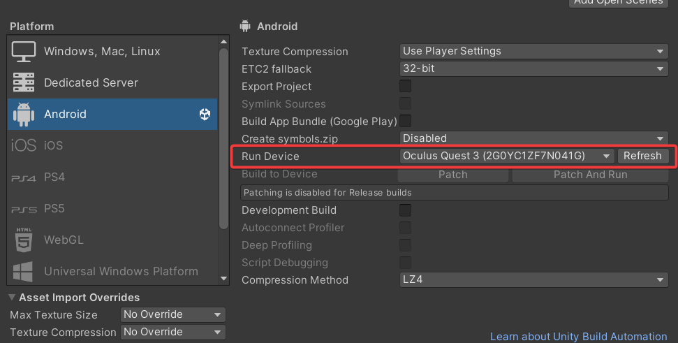 <figure><img src="https://260262196-files.gitbook.io/~/files/v0/b/gitbook-x-prod.appspot.com/o/spaces%2FpYxFg97YnJX96UzNNTSd%2Fuploads%2Fgit-blob-7841e0d9b92a4085426889defba5fe94c0f8bec5%2Fimage.png?alt=media" alt=""><figcaption><p>Quest set as Run Device in Build Settings</p></figcaption></figure>