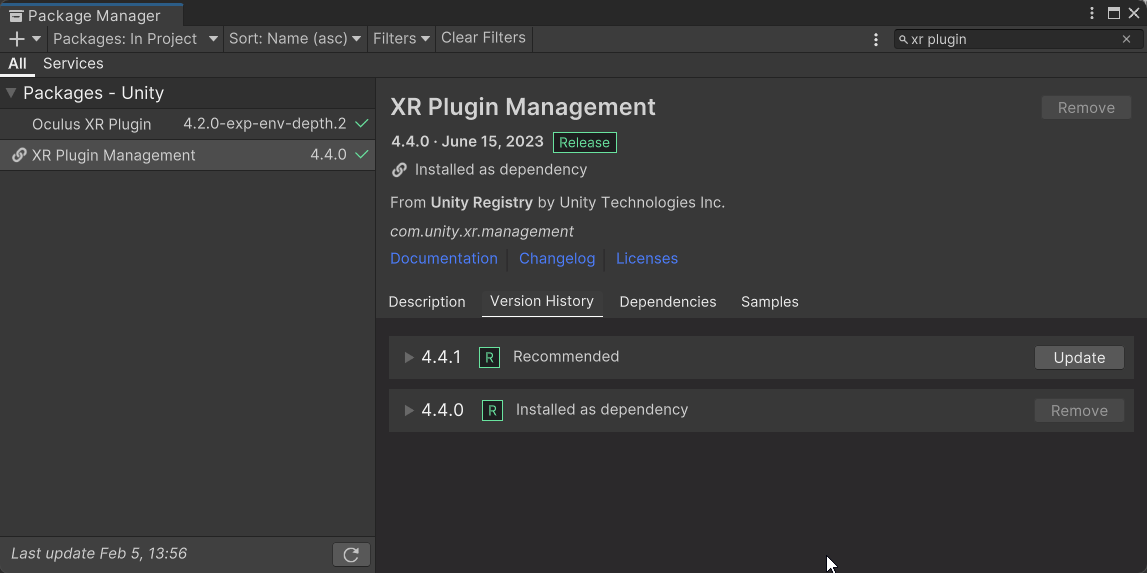 <figure><img src="https://260262196-files.gitbook.io/~/files/v0/b/gitbook-x-prod.appspot.com/o/spaces%2FpYxFg97YnJX96UzNNTSd%2Fuploads%2Fgit-blob-e1d9e45918844ddee370c21f66bd76c2e66927fe%2Fimage.png?alt=media" alt=""><figcaption><p>XR Plugin Management Installation via Package Manager</p></figcaption></figure>