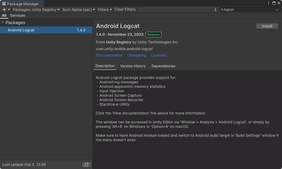 Install Android Logcat via the Unity Package Manager: