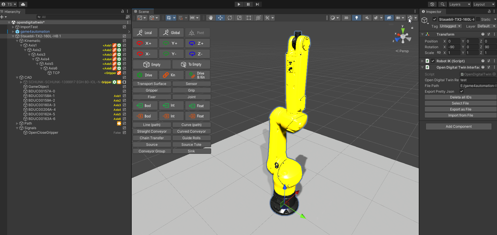 The data structure of the Open Digital Twin Interface consists of a relatively simple and readable JSON which transmits additional information to the 3D data. The 3D data can be designed as JT, Step, OBJ or FBX. An exporter from the CAD system is therefore relatively simple, since usually one of the formats can already be written by the CAD system. The data in the JSON references elements contained in the CAD data and thus supplements them with additional information on drives, kinematics and sensors.