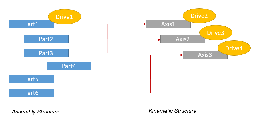 CAD designs are mostly not kinematic structured. Therefore, the KinematicAssembly optionally builds a parallel kinematic structure. Each part in the design structure can be assigned to an element Kinematic in the KinematicAssembly. Drives and Sensors can be attached to the Assembly as well as to the Kinematic Structure.