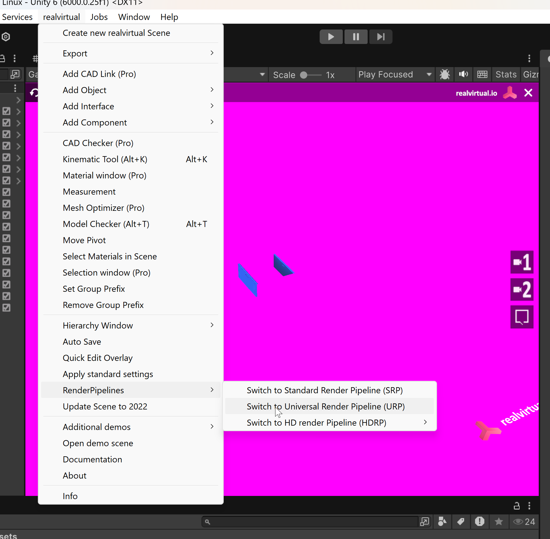 2. **Convert Materials to URP:** Go to **Tools > realvirtual > RenderPipelines > Switch to Universal Render Pipeline (URP)**. This action will convert all materials in your project to be compatible with URP.