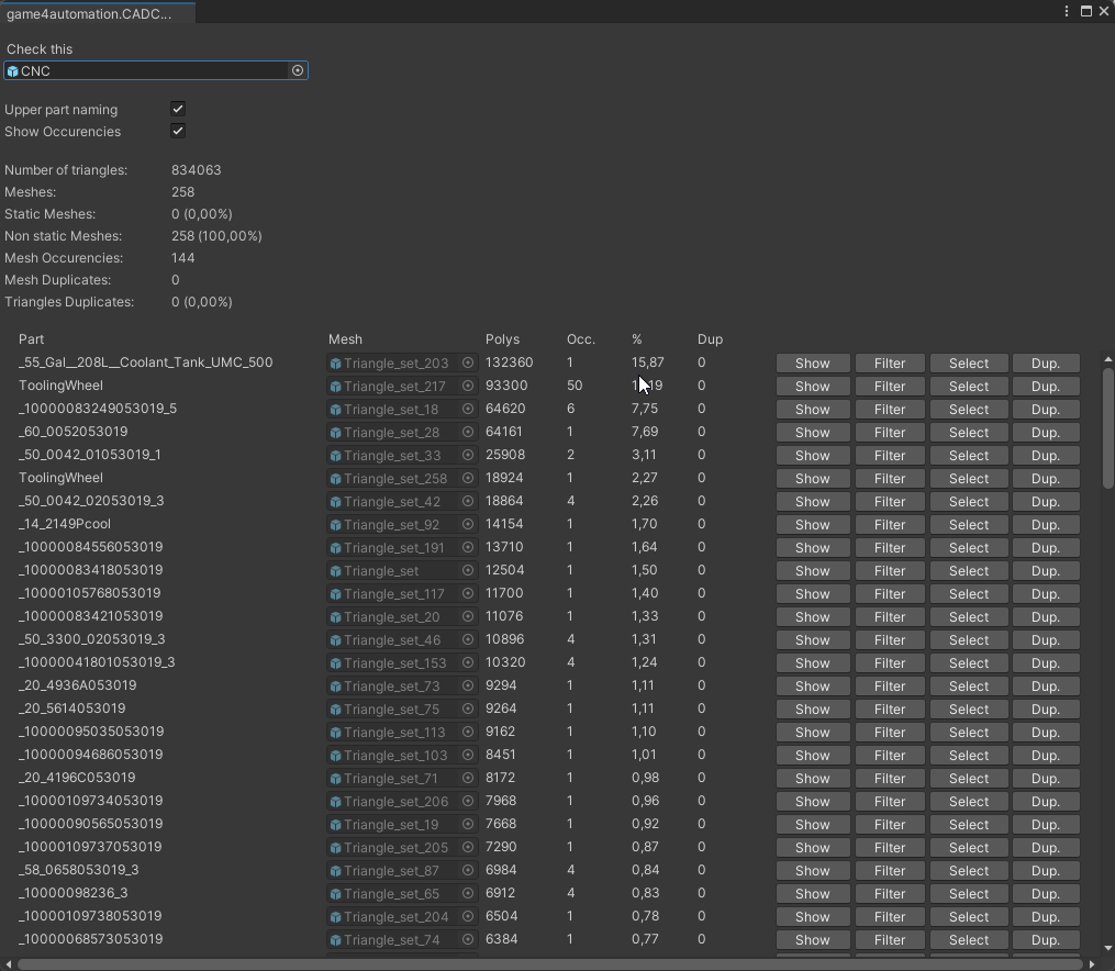 Now you can see the total number of meshes and triangles in the model. The list is displaying you all meshes sorted by the total number of polygons. This means that _CarrierA in the model has in total 372912 Polygons with 34 occurrences. That means that 34 identical meshes are in the model. These meshes make 372912 Polygons. But there are also 10 Duplicates in the model. Duplicates are identical meshes with identical positions. Usually, you should prevent to have duplicates in the model because they are normally unnecessary.