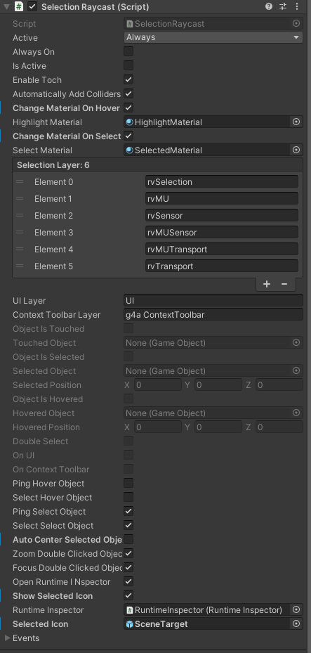 <figure><img src="https://260262196-files.gitbook.io/~/files/v0/b/gitbook-x-prod.appspot.com/o/spaces%2FpYxFg97YnJX96UzNNTSd%2Fuploads%2Fgit-blob-0c38d1c6f2e73e2ec1f74312b3318f076ea841a7%2FrvselectionRaycast.png?alt=media" alt=""><figcaption><p>Additional settings for Object Selection in SelectionRaycast component on the main camera.</p></figcaption></figure>