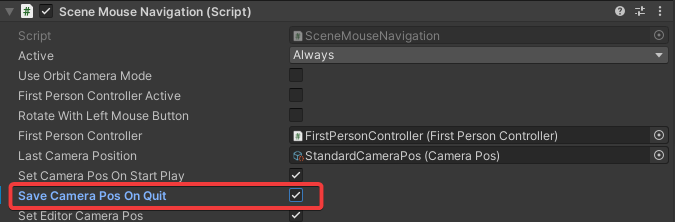 Camera positions, perspective settings as well as the settings for the orthographic side views are saved to the current values as soon as you quit the scene. This is done by the *CameraPos* Scriptable asset. This asset can be assigned in the *SceneMouseNavigation*, which is attached to the main camera.