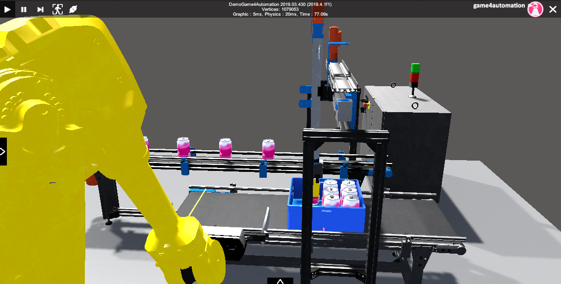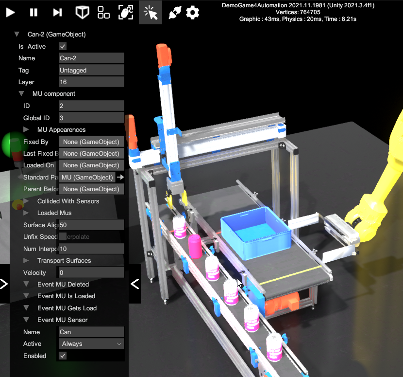 While navigating the scene with the mouse pointer, moving the pointer over an object will highlight it. By clickon on an object it will get selectid. If the *RuntimeInspector* is enabled in [RealvirtualController](https://doc.realvirtual.io/components-and-scripts/game4automation) the properties of the selected objectare displayed. The "Runtime Inspector" is disabled in the [demo model.](https://doc.realvirtual.io/basics/demo-model)