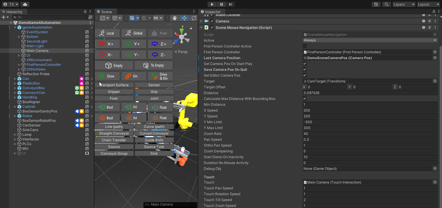 The scene mouse navigation is controlled by a script which is attached to the Main Camera, which is part of the realvirtual.io prefab. With the *SceneMouseNavigation* properties you can change the behavior and speed of the mouse navigation.