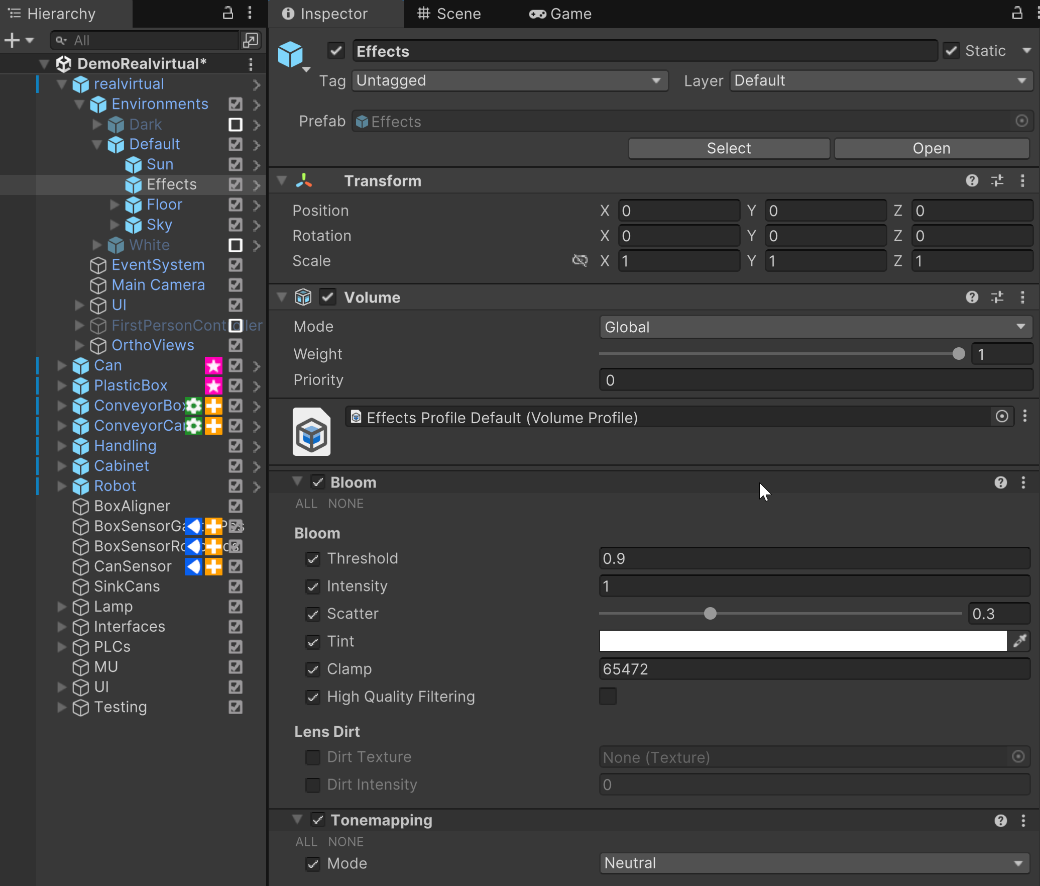 Under the Effects section of each sub-gameobject, you will find settings related to post-processing. These can be tailored to adjust the mood, tone, and visual clarity of the scene. Common properties include:
