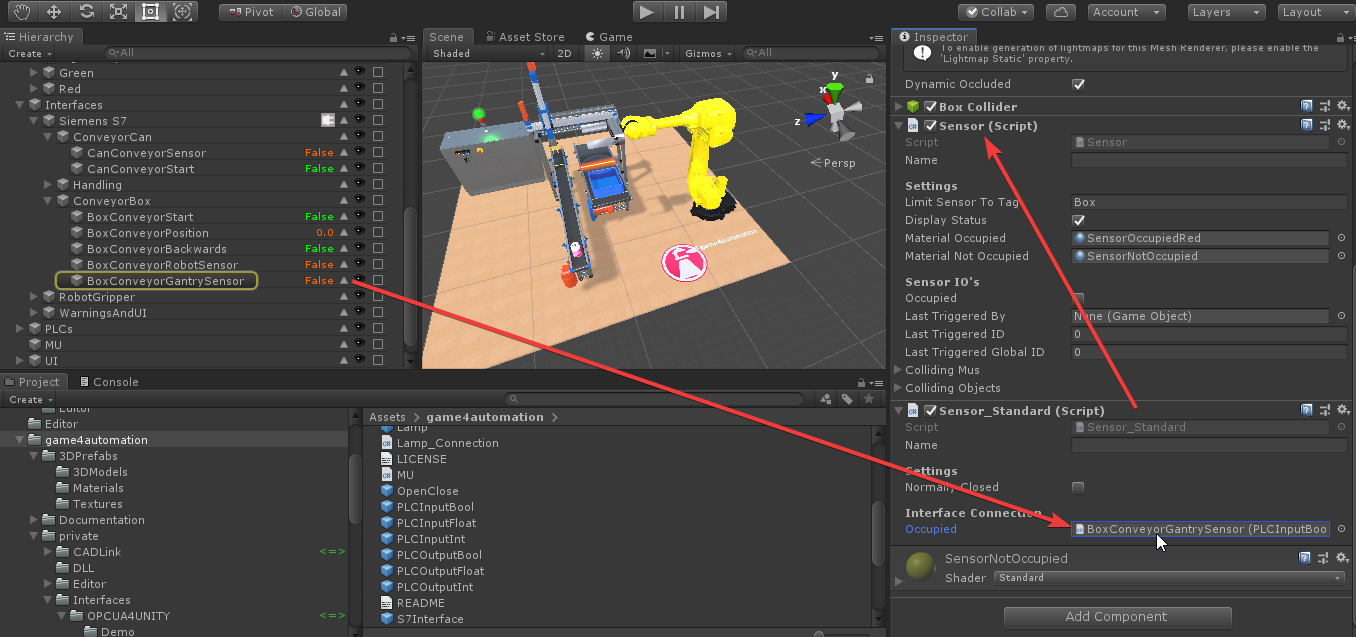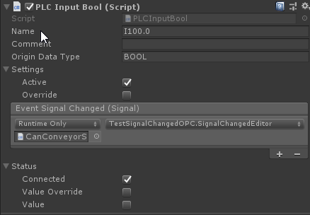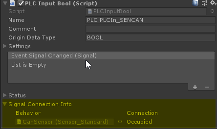 The public variable *public PLCInputBool Occupied* acts as referene to the Input Signal. Because the Sensor Behavior Model is attached to a GameObject with the Sensor base model also attached to it can get a reference to the sensor. In the Update cycle the Behavior Model is transferring the status between the Signals and the Sensor base object itself. Behavior Models give you the flexibility to program different behaviors and to still use the same base objects.