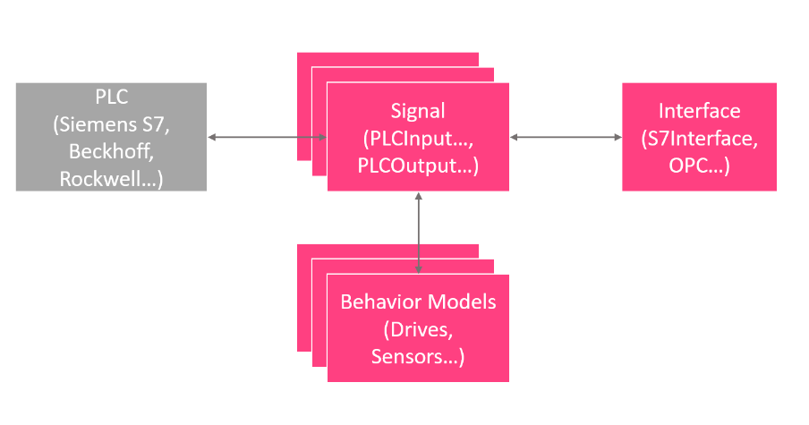 The Signals are connected to the input and output properties of the[ Behavior Models](https://doc.realvirtual.io/components-and-scripts/motion/drive-behavior).