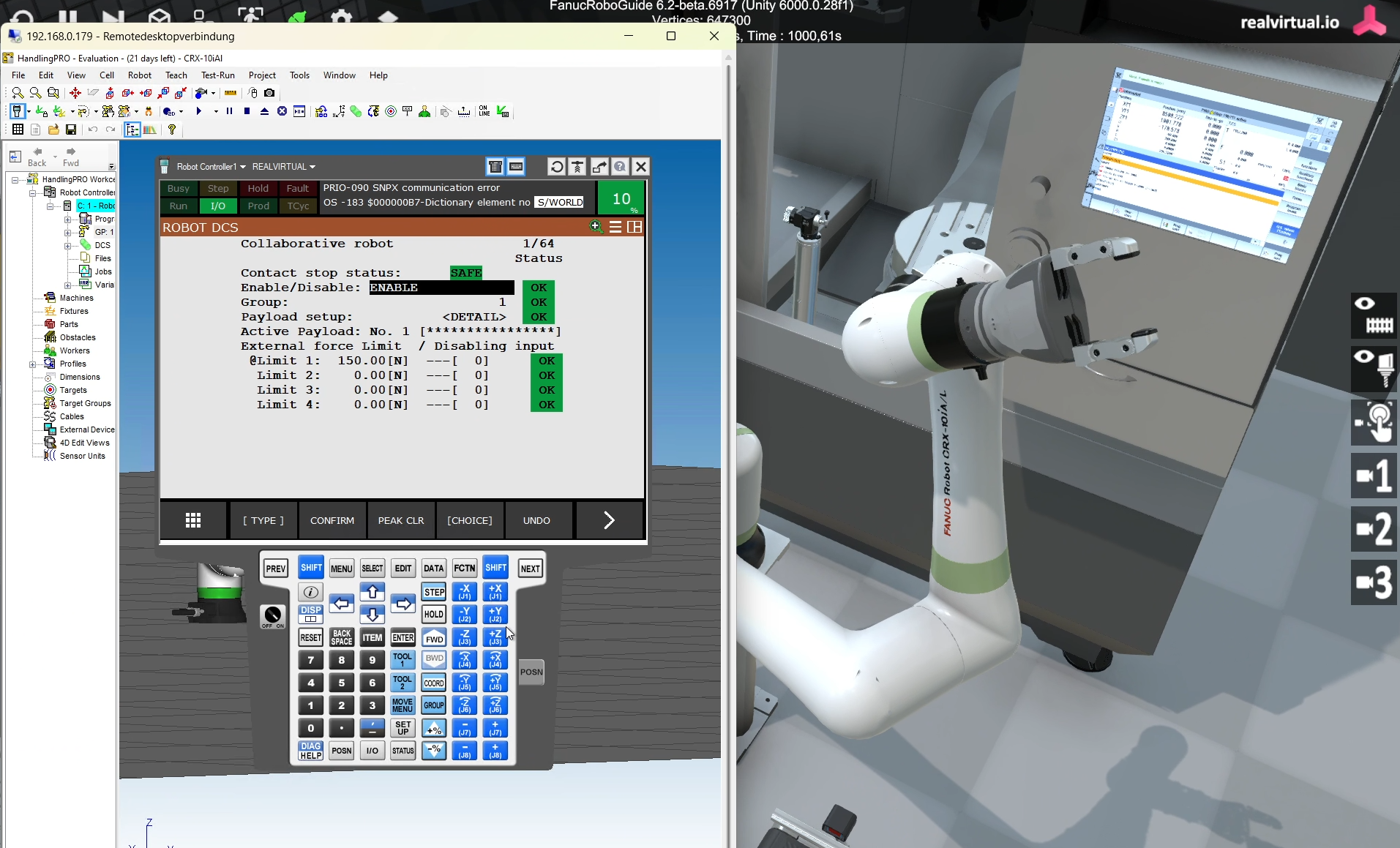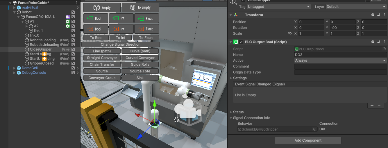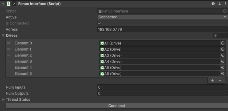 The **Fanuc Interface** component allows direct communication between Unity and FANUC industrial robots using the **SNPX (Robot Interface / SRTP)** protocol. It enables real-time control of robot drives, digital and analog I/O, and access to internal robot variables — supporting use cases like digital twins, simulation, and live operation.