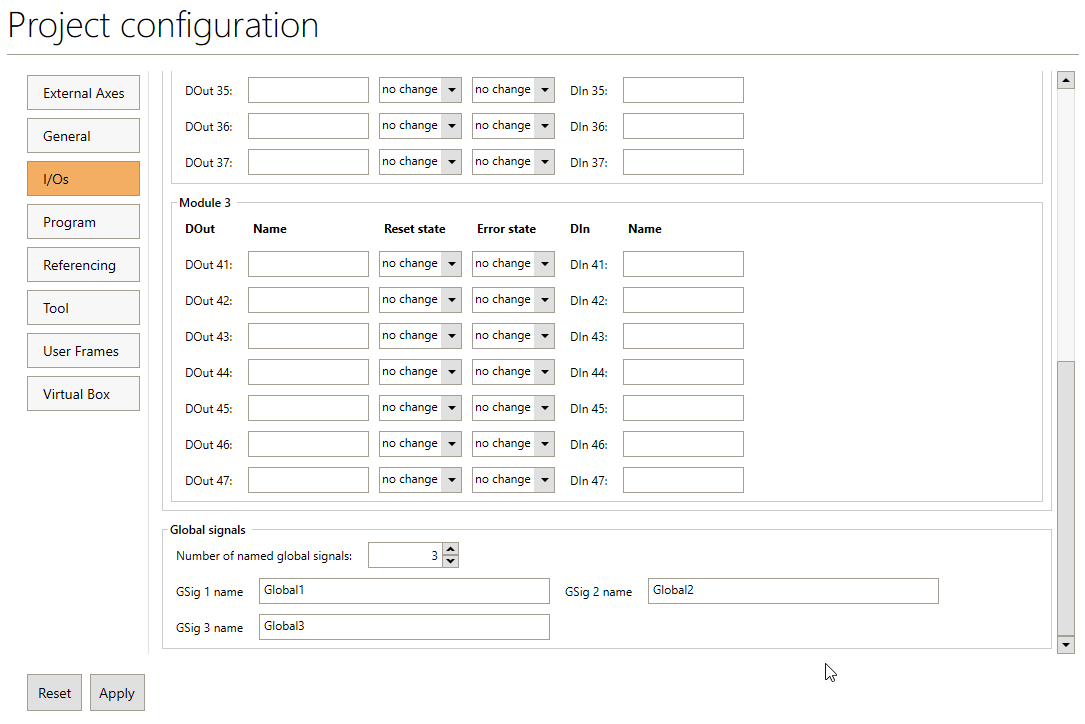 **Global Signals**: Serve as inputs to the robot controller and must be configured within the iRC software's **Project Configuration**.