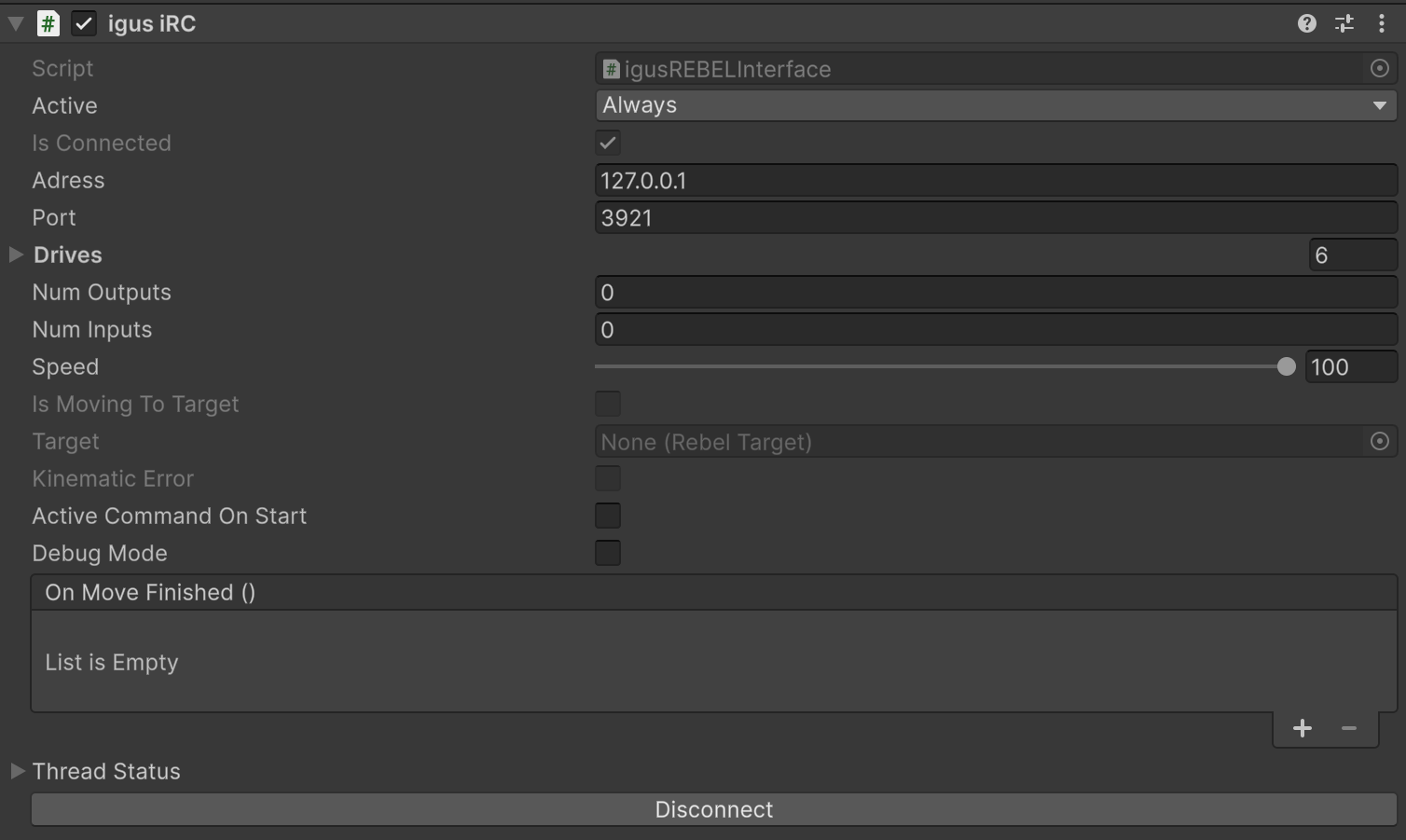 **On Move Finished** (UnityEvent) Event invoked when a position-based move command completes. Use this to chain movements or trigger actions after the robot reaches its target.