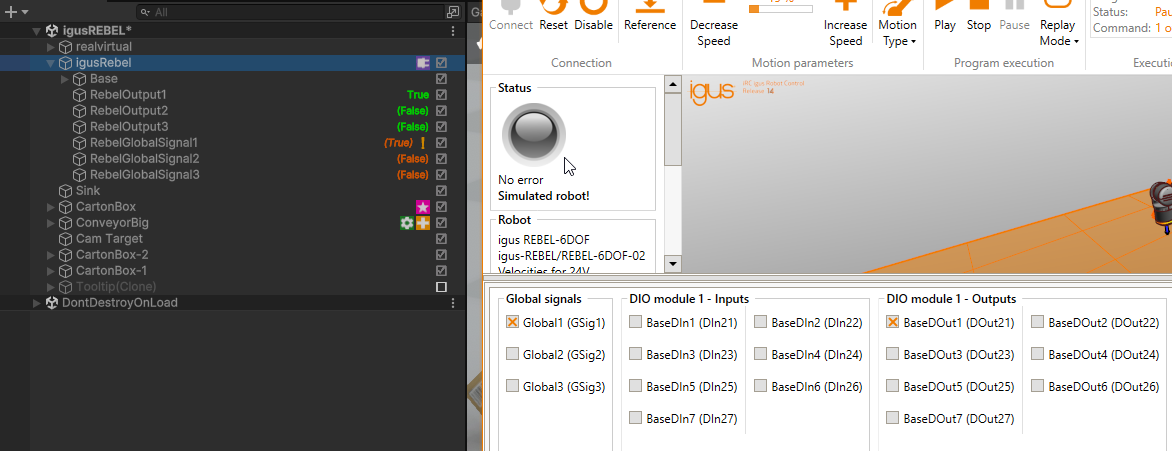 **Note**: Digital Inputs on the igus robot cannot be controlled directly from the simulation. These inputs are controlled by the robot controller. Use Global Signals instead.