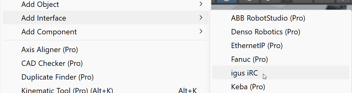 <figure><img src="https://260262196-files.gitbook.io/~/files/v0/b/gitbook-x-prod.appspot.com/o/spaces%2FpYxFg97YnJX96UzNNTSd%2Fuploads%2Fgit-blob-9652178cf9c61791053c5d2dff2f363014cfd9dd%2Figus-addinterface.png?alt=media" alt=""><figcaption><p>Adding the igus iRC Interface from the menu</p></figcaption></figure>