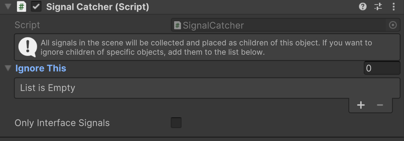 The Signal Catcher is a tool designed to automatically collect and organize signals within a loaded scene. This is particularly useful when signals are included in imported prefabs or when using multiple interfaces of the same type across different additive scenes.
