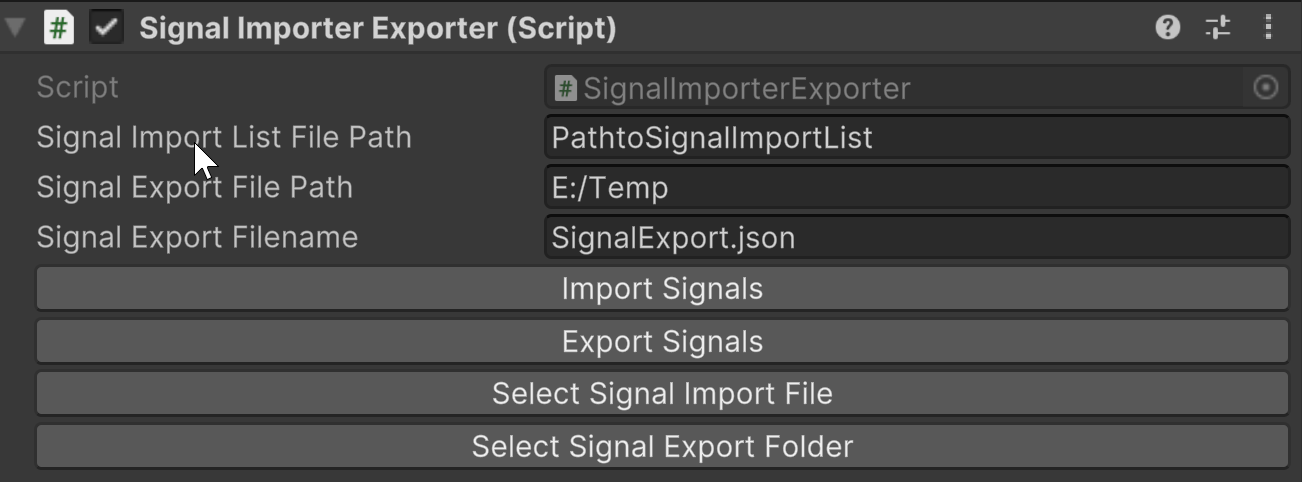 The Signal Importer Exporter can be attached to any GameObject that represents an interface in realvirtual.io. It automatically detects and imports/exports all signals located underneath that GameObject in the hierarchy.