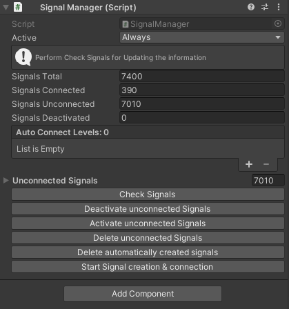 To use the Signal Manager, it must be added as a component to the game object that contains the imported signals as subcomponents (and usually the interface itself).