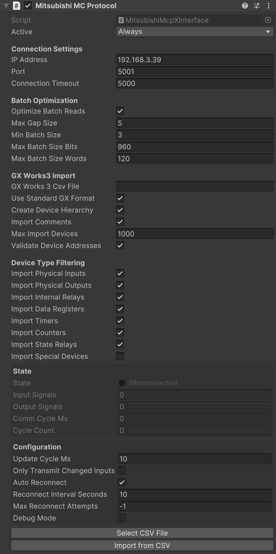 2. **Manual Method**: Add the `MitsubishiMcpXInterface` script to an empty GameObject