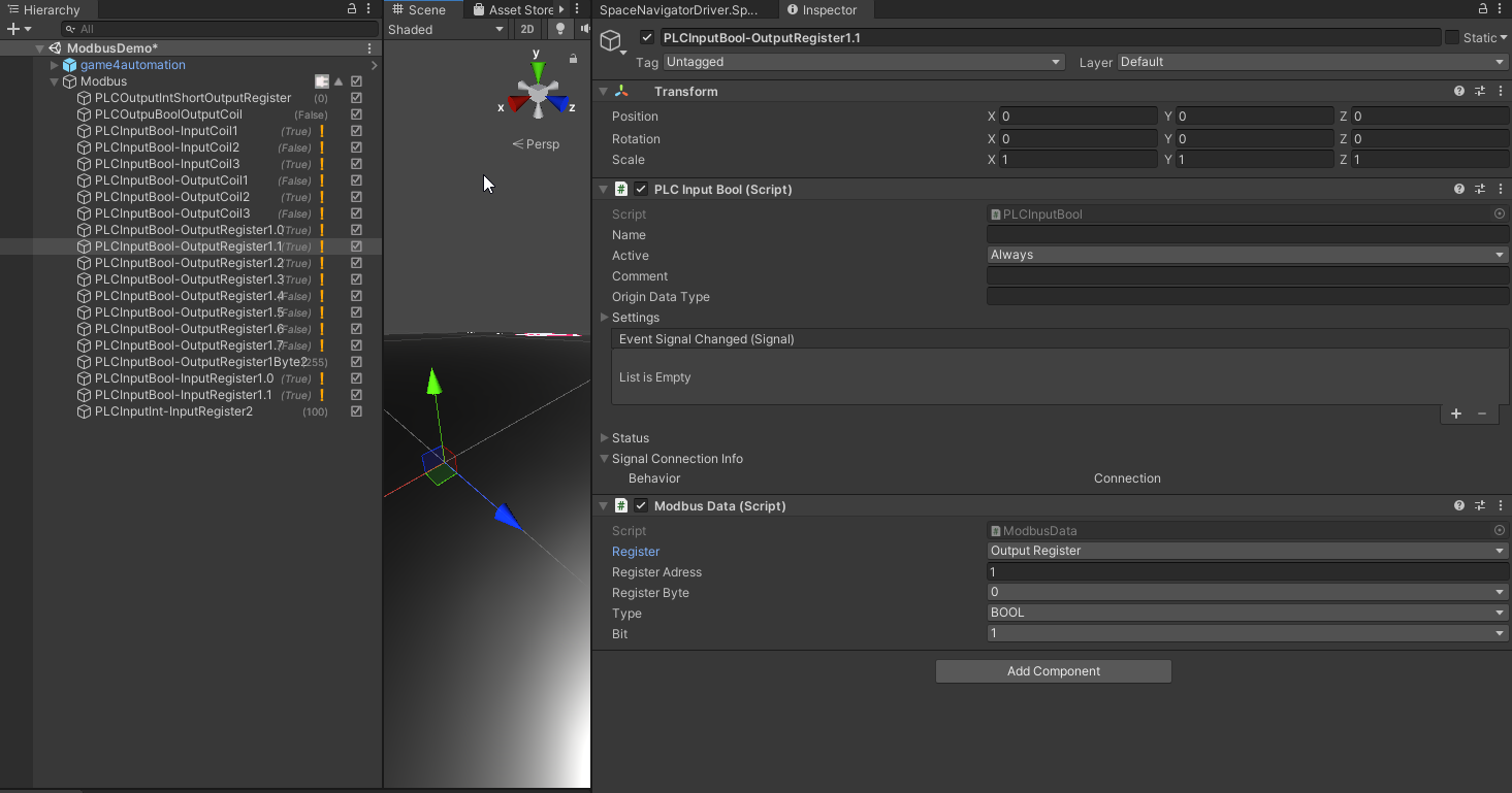 Each PLCInput or PLCOuput signal needs to hava an attached ModbusData component. This component is defining with its properties how the bits and bytes should be interpreted by realvirtual.io.