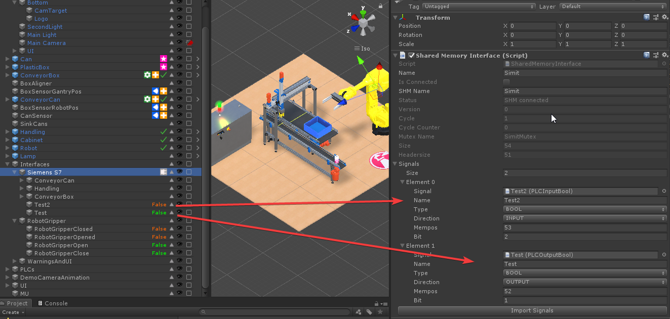 You can now push on *Import Signals* in the Shared Memory Interface inspector. You will get all Signals available in Simit created as Sub-Gameobjects under your Interface (in the example the signals Test2 and Test). Please keep in mind, that no signals are deleted automatically. Import signals is only adding and updating but not deleting any signals. If you now push *Play* in Unity you will see, that during simulation the signals are updated automatically.