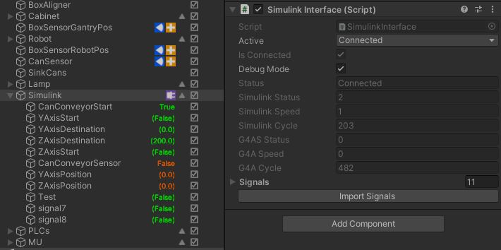 After this Simulink can be startet and the Signals can be imported by pushing on the Button *Import Signals*. You will now see all Simulink Signals as Singal Objects underneath your Simulink interface and you can connect them to your realvirtual.io objects.