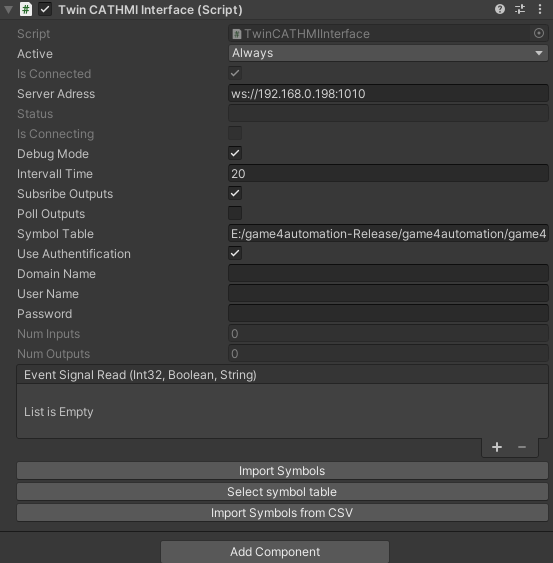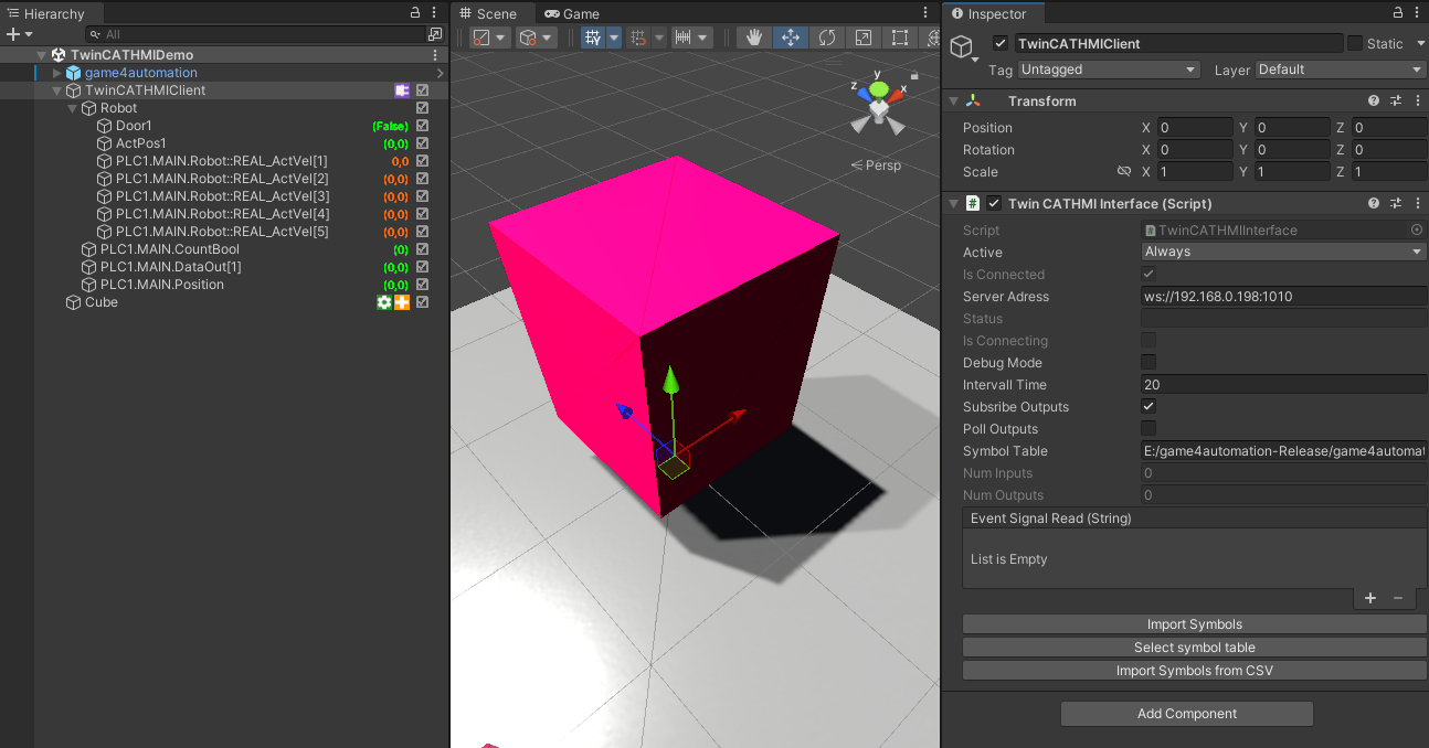 This interface is beside TwinCAT ADS another interface for Beckhoff PLCs. It requires HMI licenses on the TwinCAT PLC. The advantage of this interface is that it does not depend on an installation on the device on which the simulation model is running. Communication takes place exclusively via WebSockets. This interface works on any type of target platform and also works within WebGL builds.