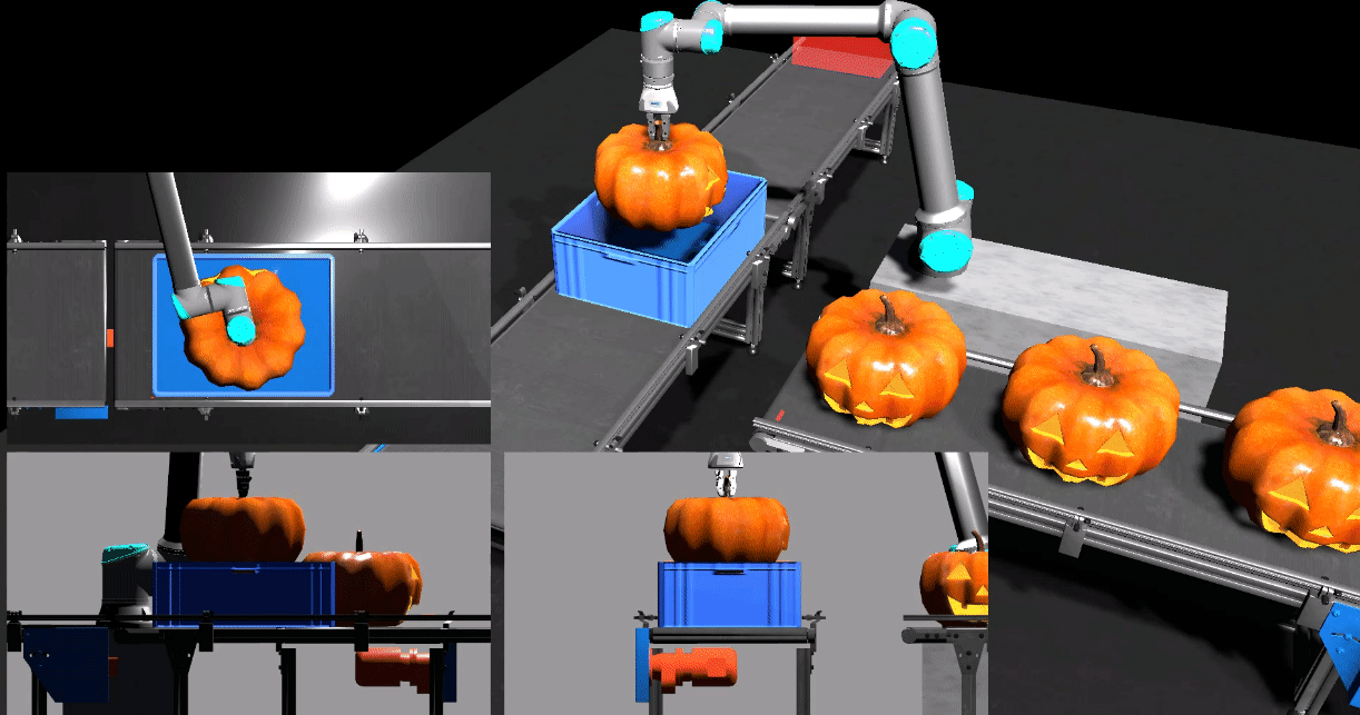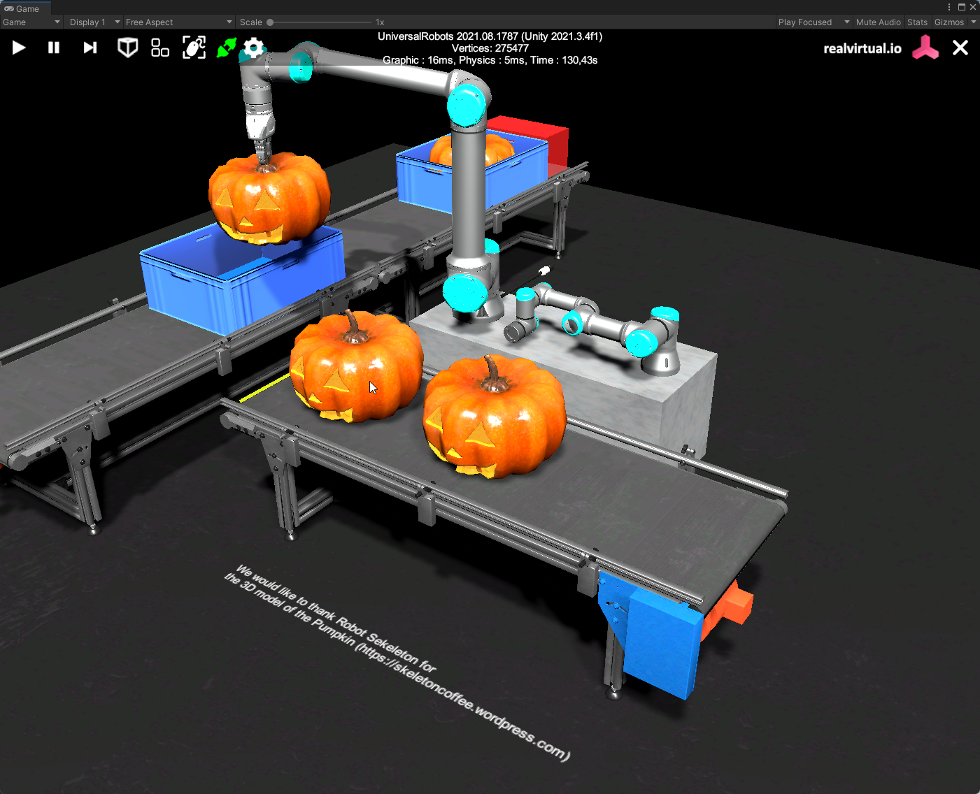 In the folder realvirtual/private/interfaces/UniversalRobots there is a demo scene where pumkins are loaded into a box. The PLC logic is mapped in realvirtual.io with LogicSeps within the Gameobject Logics. The UR robot is controlled with input and output signals. In the scene you will find a UR10 robot that is used for the demo scene and a fully prepared UR3 robot that is switched off.