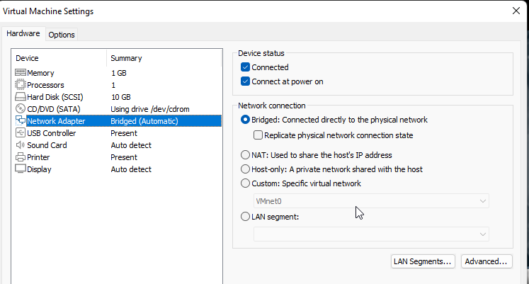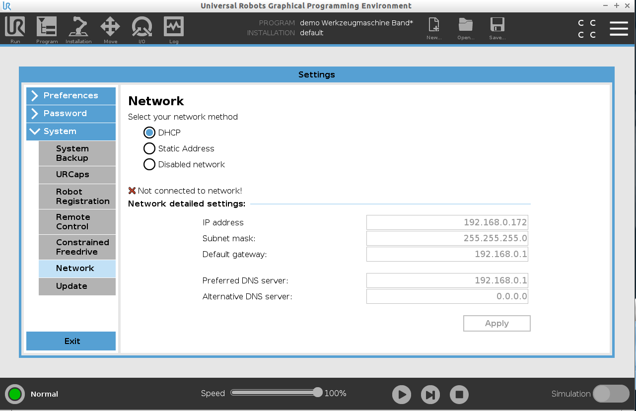 You can download URSIM from the Universal Robots website. There you will find a virtual machine image which can be run with VirtualBox or VMWare. The communication with the (virtual) robot controller is done via TCP-IP, this is why it is important, that the robot controller and realvirtual.io are connected to the same network. Please use bridged network settings within the Virtual Machine: