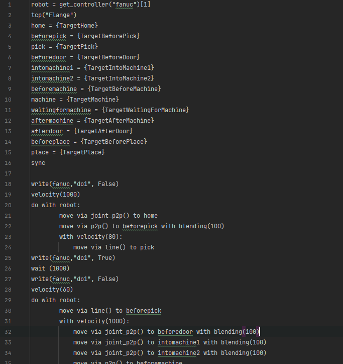 {Targetname}in the program template.Automatic Target Insertion: When starting the robot program via realvirtual, all targets (joint or pose definitions) will be inserted automatically into the program.