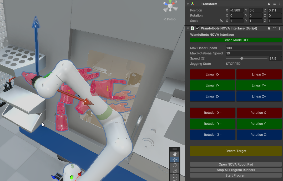 The Wandelbots interface allows teaching robot targets directly in the Unity Editor without switching between Edit and Play modes. You can use the NOVATarget Prefab, placing it under the Target Root, to define positions for the robot.