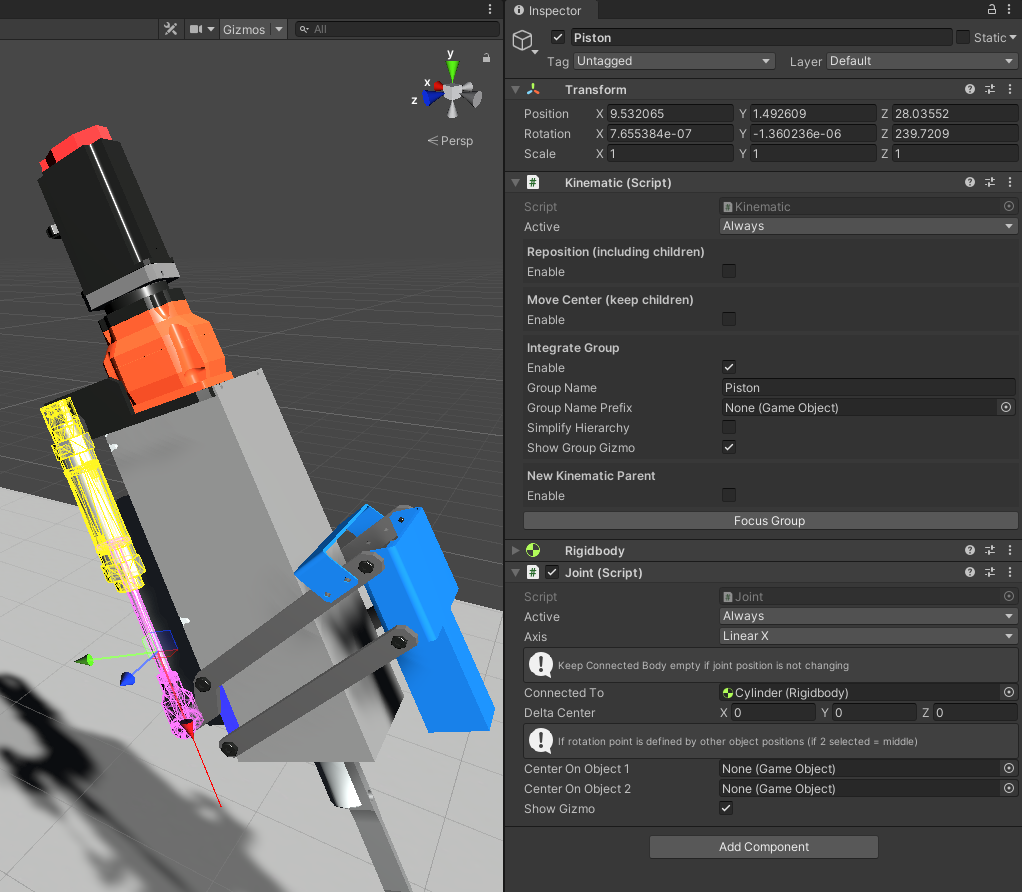 With the Joint component you can define cylindrical and linear joints with the same kind of axis and direction definition you already know form realvirtual.io drives. Additionally the connected Rigidbodies will be automatically shown as a Mesh Gizmo in yellow (see picture above).