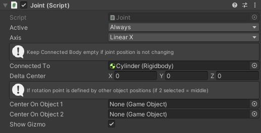 **Delta Center** you can move the center of the Joint axis by the defined values. If the value is zero the center point of this joint is in the pivot point of the gameobject the Joint script is attached to.