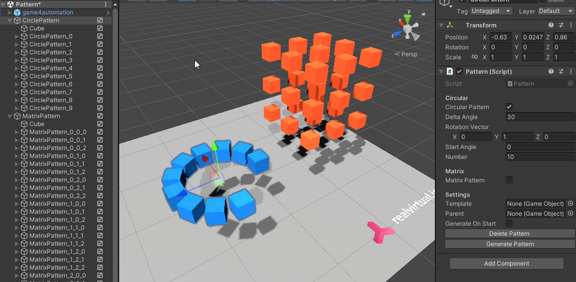 Pattern is an auxiliary component for creating circular matrix patterns. This can be used for example when you need to place many realvirtual.io components in a certain way (e.g. you need many fixers on a wheel with vacuum grippers). The pattern game objects are created based on a template and some geometric information about the spacing of the pattern components.