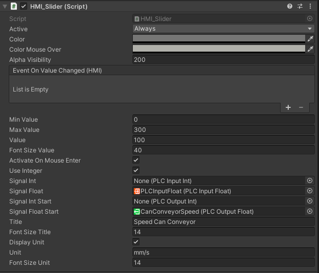 The HMI Value slider can set PLCInputFloat or PLCInputInt values on the connected PLC..