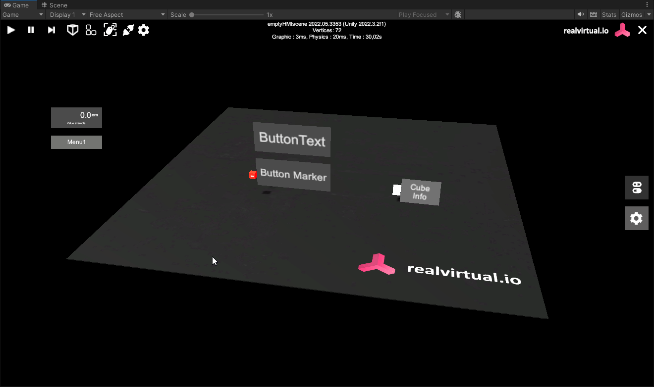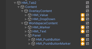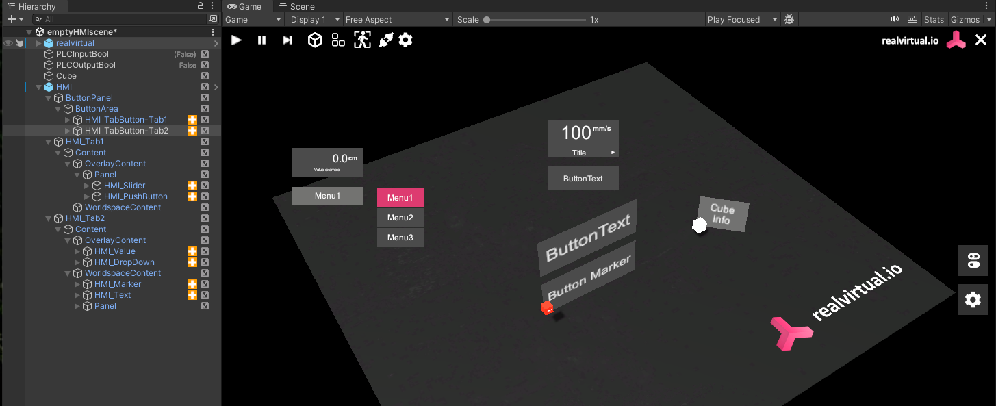 The "WorldspaceContent" section contains two separate elements: [HMI\_Marker ](https://doc.realvirtual.io/components-and-scripts/scene-interaction/hmi-components-pro/hmi-marker)and [HMI\_Text](https://doc.realvirtual.io/components-and-scripts/scene-interaction/hmi-components-pro/hmi-text). The HMI\_Text, as well as the [HMI\_Value](https://doc.realvirtual.io/components-and-scripts/scene-interaction/hmi-components-pro/hmi-value), check if they're positioned beneath a canvas. If no canvas is found in the parent object, the "Canvas" component is automatically added and set to "Worldspace" render mode. This feature is currently only available for this HMI-elements. For the other HMI-elements you can use the `HMI_PanelWorldSpace` prefab, which already includes the canvas component. Just place this prefab under "WorldspaceContent." Subsequent HMI elements are added beneath the panel. This approach allows you to create a user panel within your scene. The [HMI Marker](https://doc.realvirtual.io/components-and-scripts/scene-interaction/hmi-components-pro/hmi-marker) doesn't need a canvas because it is a 3D object.