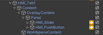 HMI-Tab1 shows how to set up a overlay panel. The game object "Panel" uses the component "VerticalLayoutGroup" to organize the buttons by setting the padding and the spacing in between elements.