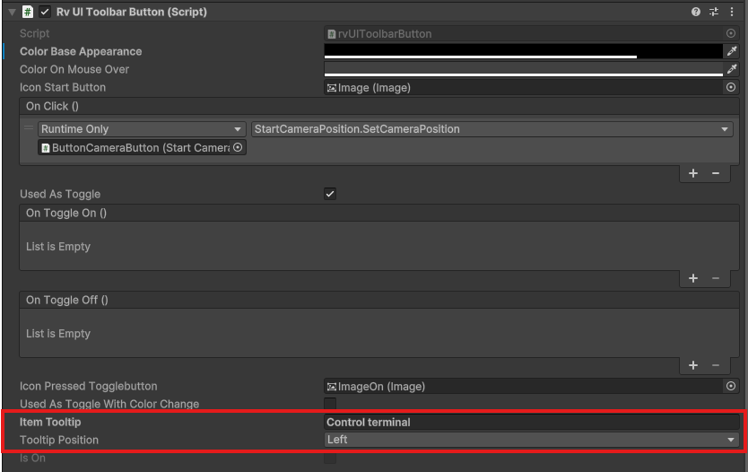 All button prefabs include the `rvUIToolbarButton` component, where you can configure the following parameters:
