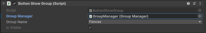 The `ButtonShowGroup` component provides a list of groups available to the user in Playmode. Select a group to control its visibility with the button.