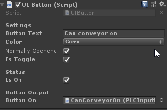 The Button can be placed in a UI Panel. The Button can act as a switch (changes between on and off everytime you press it) or can act as a pushbutton (only stays at on if you press it). You can select the color and the text which is displayed under the button. The connection to PLC Inputs is made by dragging the PLC Input onto the Field *Button On* or by selecting under *Button On* the desired input.