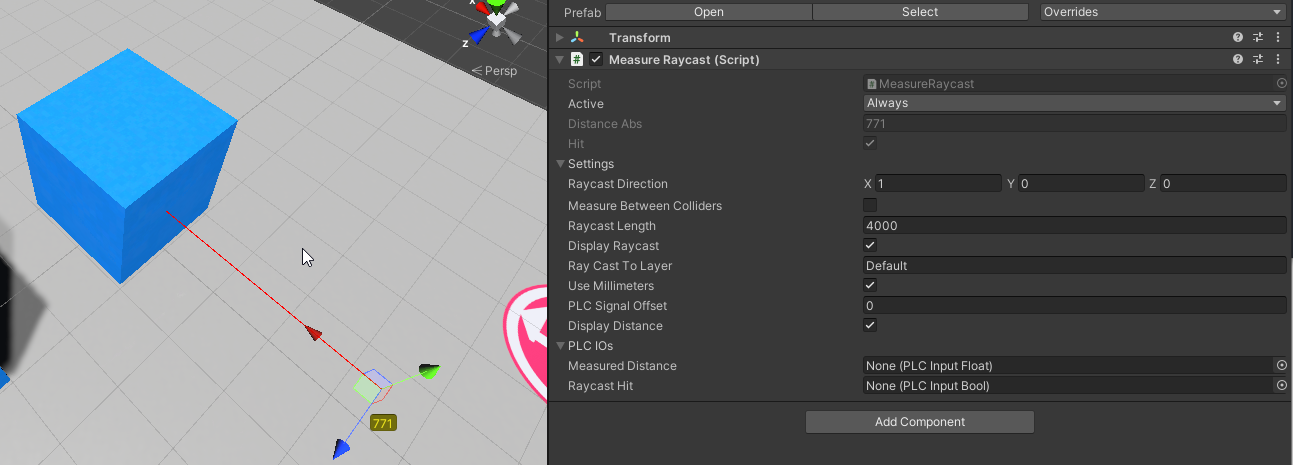 You can also connect the result of the measurement to a PLCInput Signal. By doing this MeasureRaycast is able to act as a sensor.