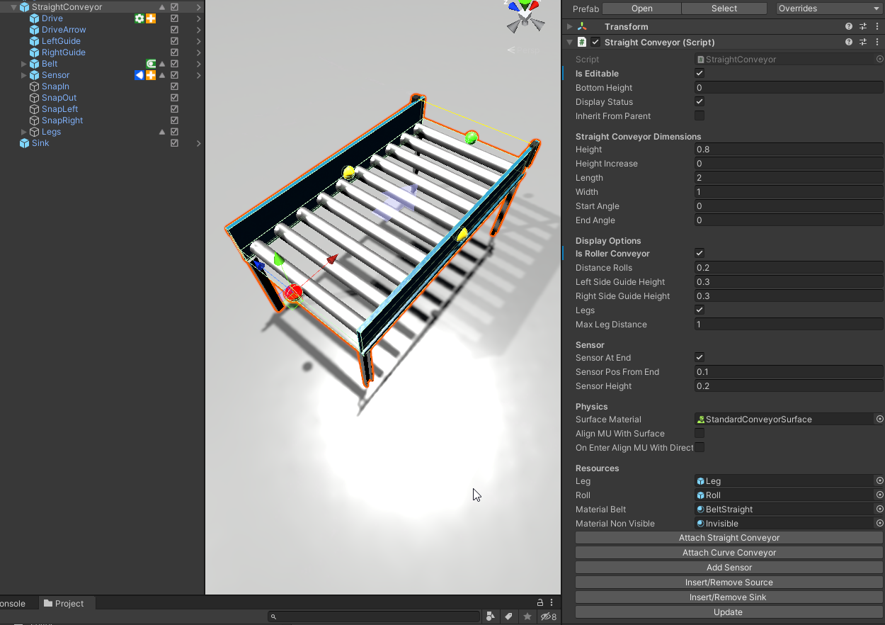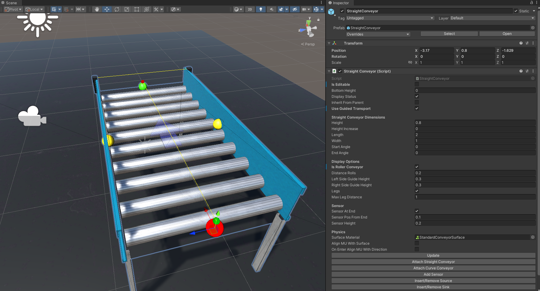 The Straight Conveyor can be displayed as either a roller conveyor or a belt conveyor. It features SnapPoints on each end and on the sides. When another conveyor is snapped to the side, the Side Guide will be removed. Each conveyor automatically includes a sensor at the end.