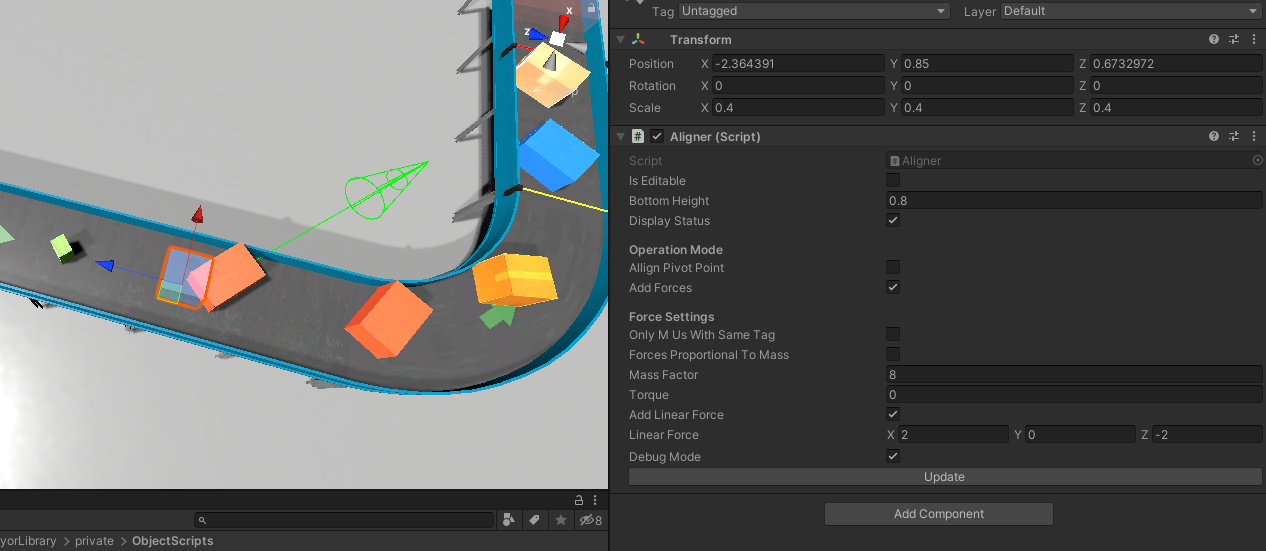 Additionally, the conveyor offers a guided transport system along a spline situated in the middle of the transport surface. This feature can be activated by ticking the checkbox "UseGuidedTransport". When enabled, items will follow a predefined path, ensuring precise and consistent movement along the conveyor. In this mode, Unity physics do not affect the transported object.
