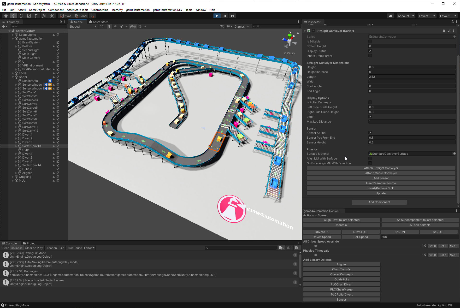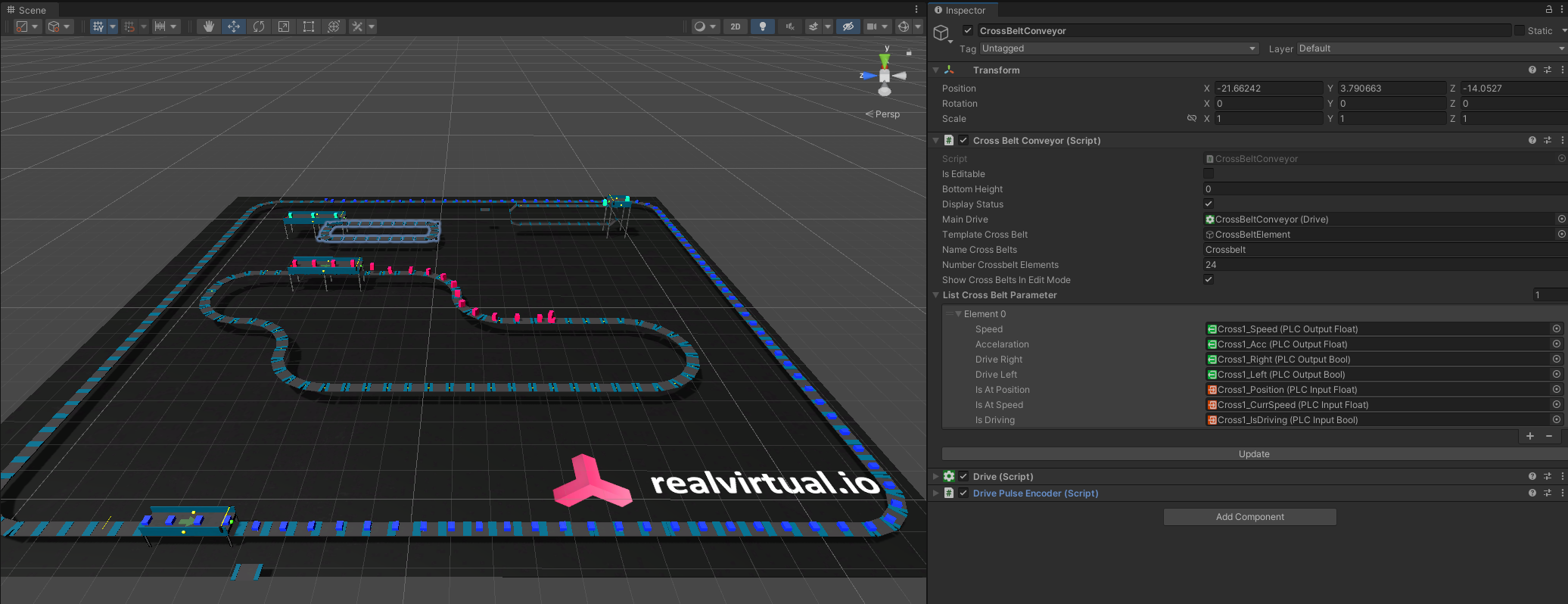 All included standard components use functions of realvirtual.io Starter or Professional. In particular, the elements of the Conveyor Library are equipped with [drives](https://game4automation.com/documentation/current/drive.html) and [sensors](https://game4automation.com/documentation/current/sensor.html). These can be controlled directly via script for simulation. For virtual commissioning, the simulation model can be connected to industrial controllers using the [automation interfaces](https://game4automation.com/documentation/current/interface.html) of the Starter or Professional version.